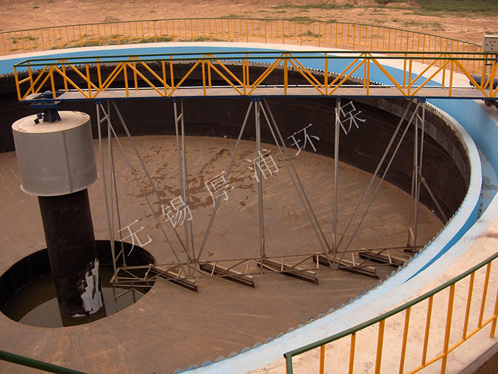 原水從池底經中心支墩上不流出,并經穩流筒配水后,呈輻射狀流向池子周邊集水槽出水,隨著輻向流速的降低,原水中的懸浮物被分離而沉降于池底。工作橋以中心支座為圓心,帶動刮泥、排渣機構,在驅動裝置驅動下將污泥刮集至沉淀池中心集泥槽,依靠水壓或泵排出池外,上部浮渣由刮渣板同步刮至排渣斗排出。