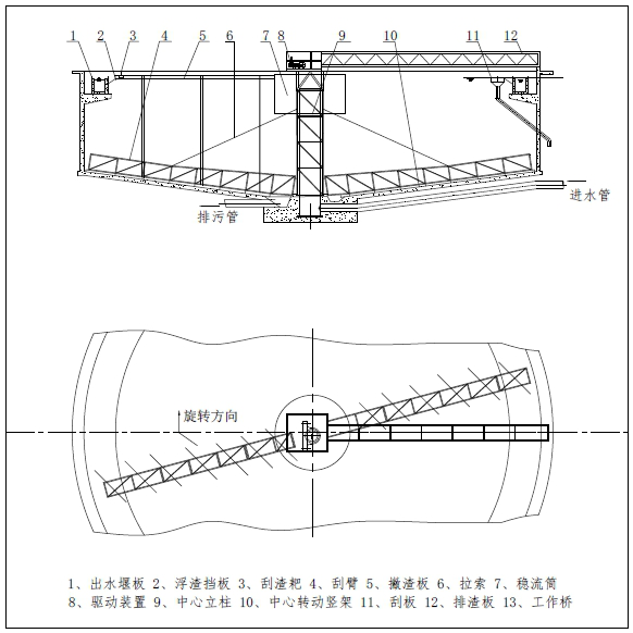 該設(shè)備采用中心傳動(dòng)、垂架式,污水從進(jìn)水管流入導(dǎo)流筒擴(kuò)散后,均勻的向周邊呈輻射狀流出,呈懸浮狀的污泥經(jīng)沉淀后沉積于池底,驅(qū)動(dòng)裝置帶動(dòng)中心豎架旋轉(zhuǎn),并帶動(dòng)刮臂及刮泥板轉(zhuǎn)動(dòng),將污泥從池周刮向中心集泥槽后,靠池內(nèi)靜水壓由排泥管排出池外。水面的浮渣通過撇渣裝置撇向池邊,再由刮渣耙刮進(jìn)排渣斗內(nèi)排出池外。而上清液則通過出水堰板溢入出水槽內(nèi)排出。