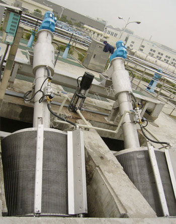 旋轉清污網筒在水中以35°傾角做每分鐘5~8r/min的圓周運動,網筒的1/3浸沒在水中。污水及漂浮物從網筒下口進入網筒內部,漂浮物附著于網筒內壁從水中帶出,當網筒轉到高點,雜質由于重力作用掉入垃圾輸送系統,經輸送壓榨至出料口。被過濾的污水經過網筒間隙流走。